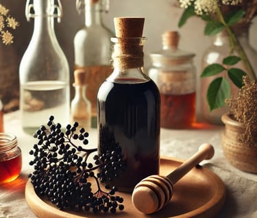 Elderberry syrup made with ACV (apple cider vinegar) is added for enhanced potency. For 6 weeks the herbs bathe in the Oxymel with Elderberry syrup, infusing their known properties into the liquid. ACV is naturally antimicrobial, and anecdotal evidence suggests it acts as an expectorant. This combined with the honey is the perfect solution to draw out the medicinal properties of the herbs. Elderberry extract is shown to be effective in mitigating the duration and severity of flu symptoms in several strains of influenza viruses. Pelagonium does much of the same, but acts on the lungs and is effective against acute bronchitis, rhinosinusitis, and COPD flares.